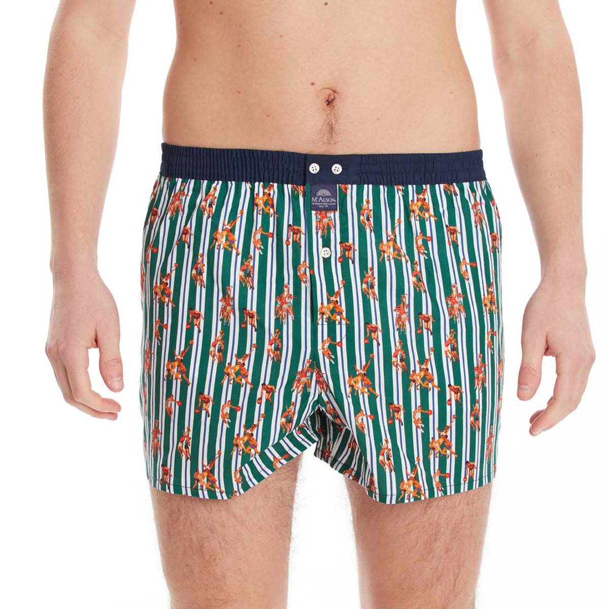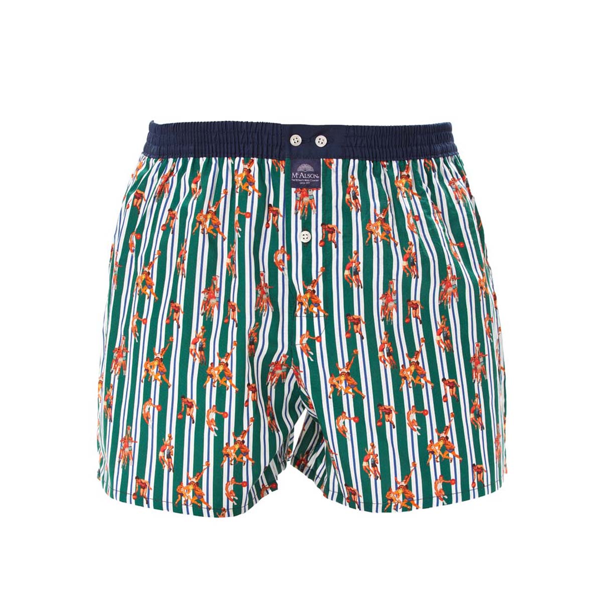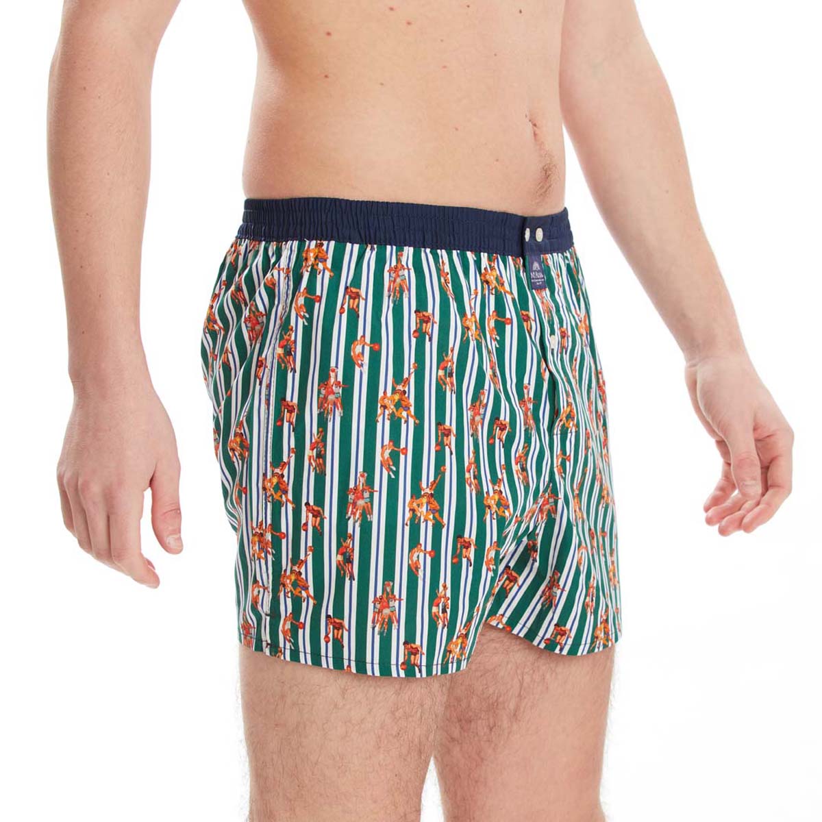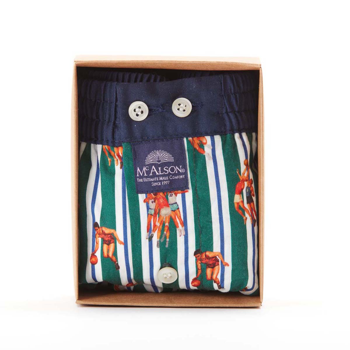 Caleçon Américain à joueurs de basket multicolores imprimés sur un fond rayé vert, bleu et blanc avec une ceinture bleu marine colorée