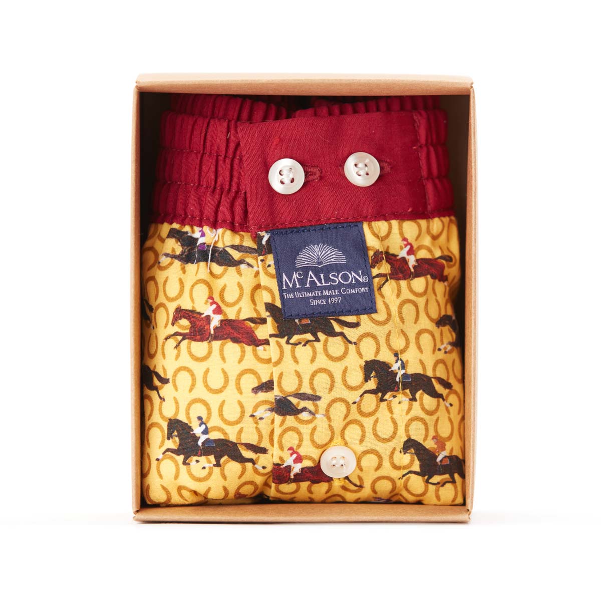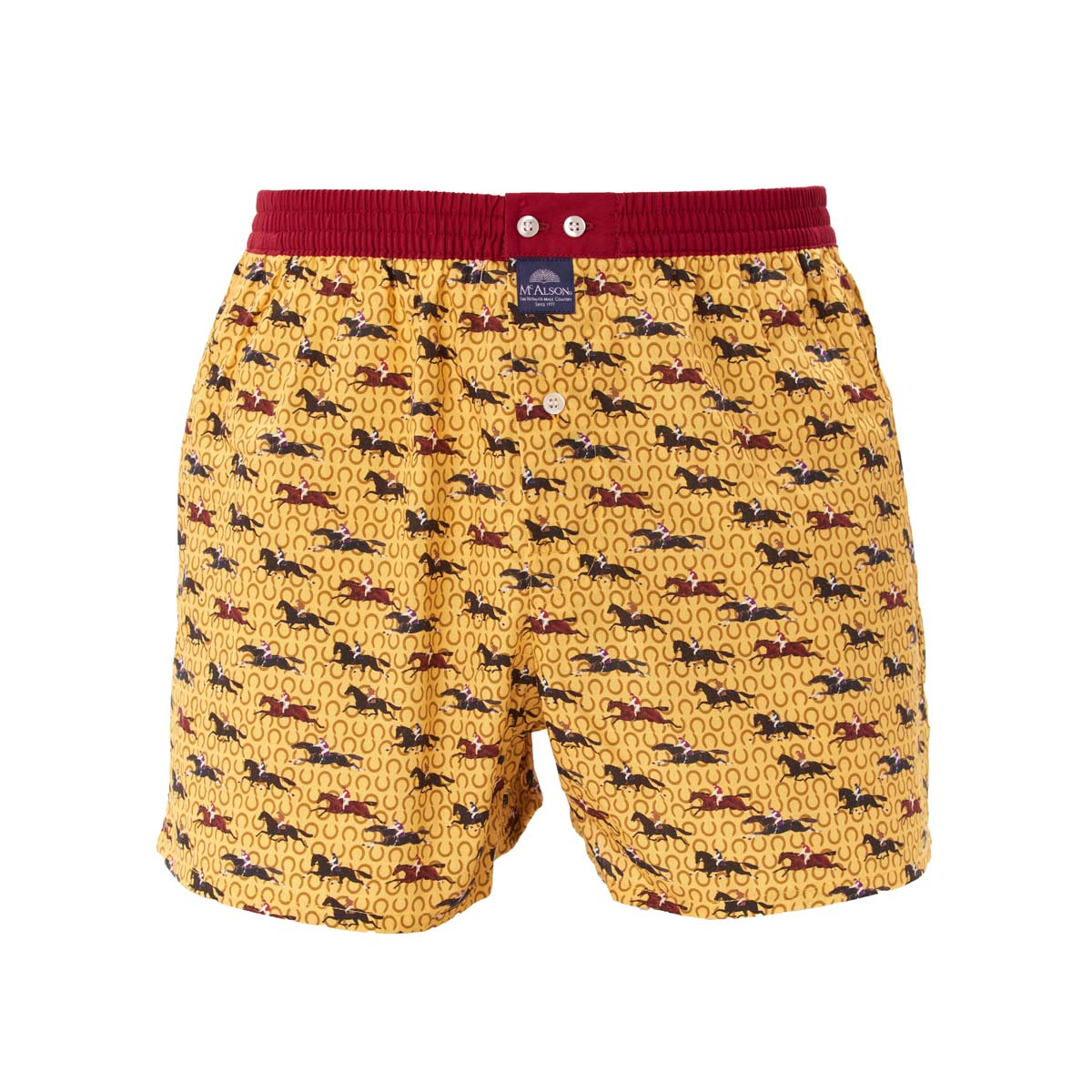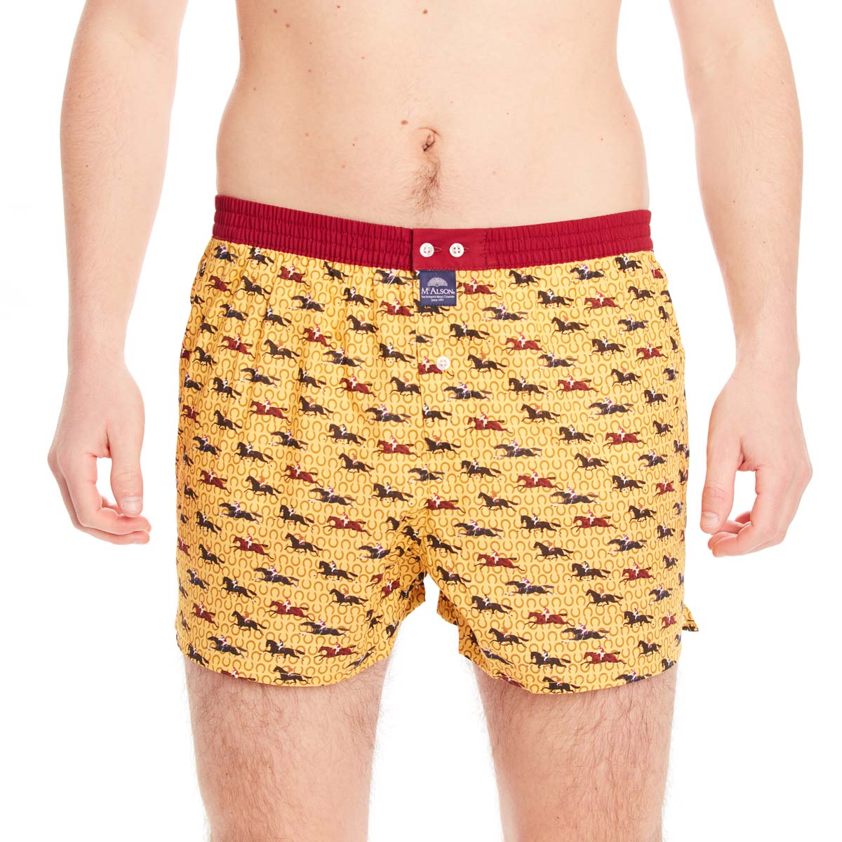 Caleçon Américain à imprimé de course de chevaux sur fond jaune avec fers à cheval marron. La ceinture est bordeaux.