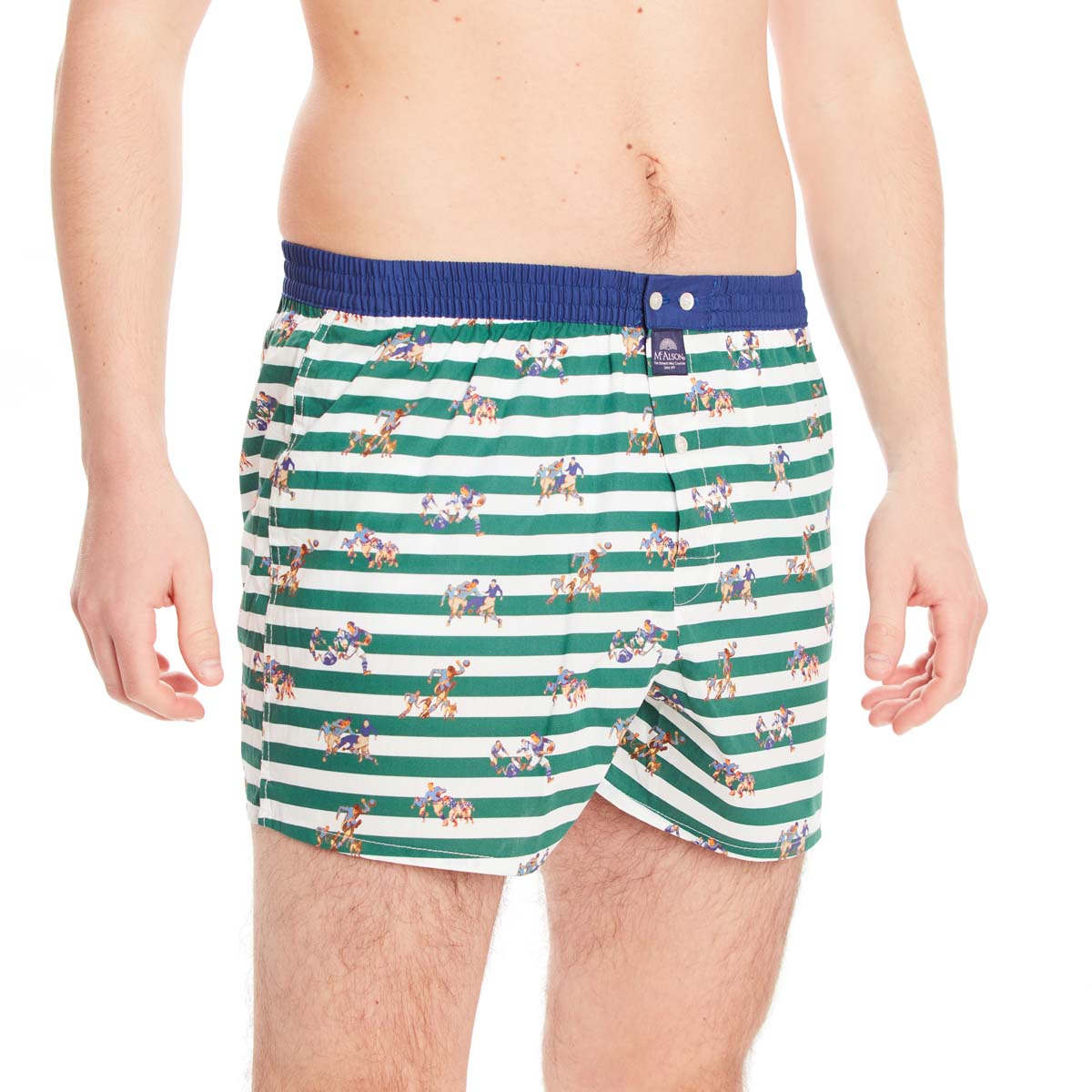 Caleçon Américain à imprimé de rugby sur fond à rayures horizontales vertes et blanches. La ceinture est bleu nuit.