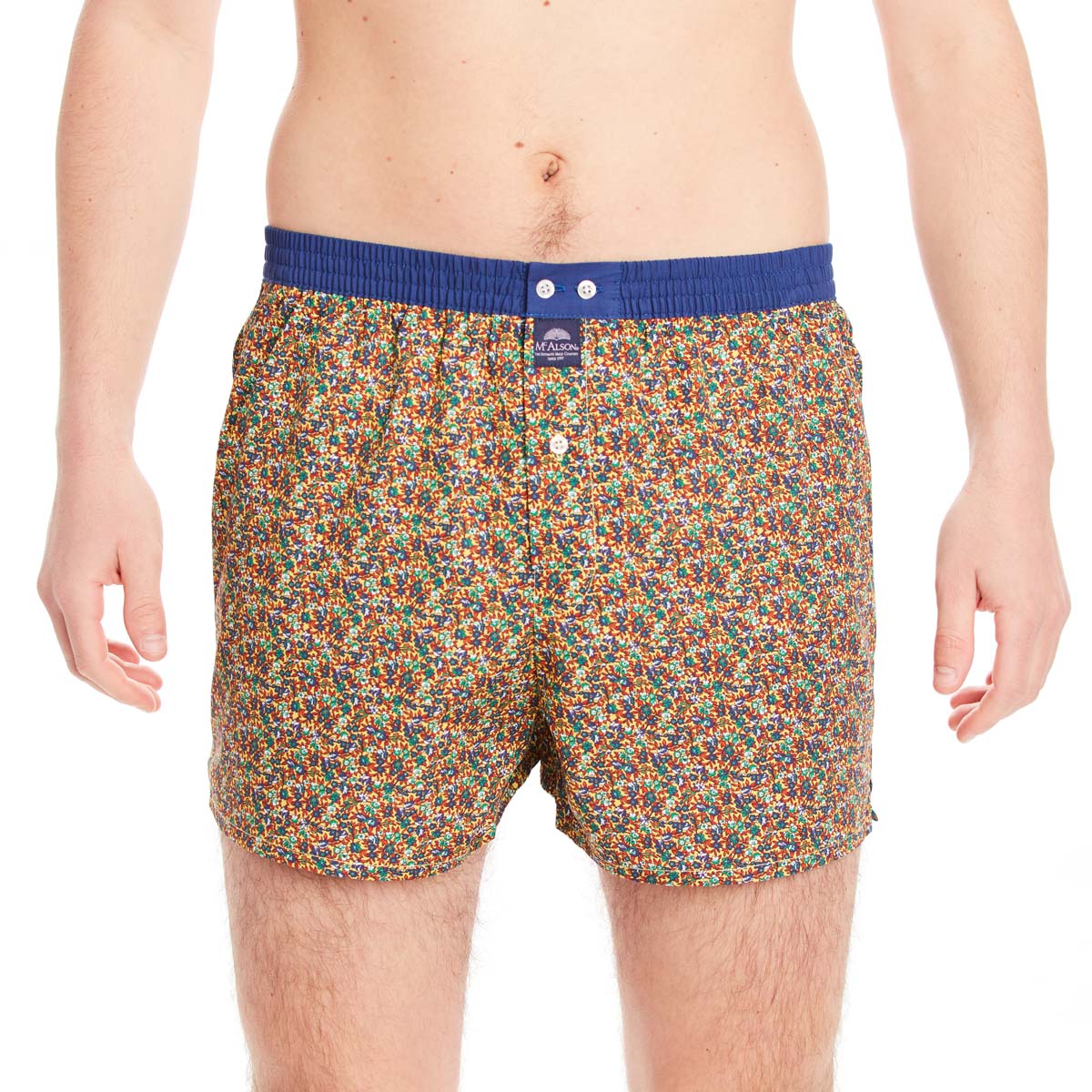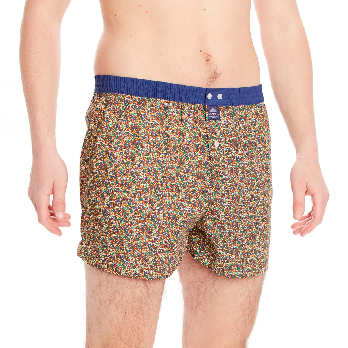 Caleçon Américain imprimé de fleurs vertes, bleu marine et orange sur fond jaune. La ceinture est bleu nuit.