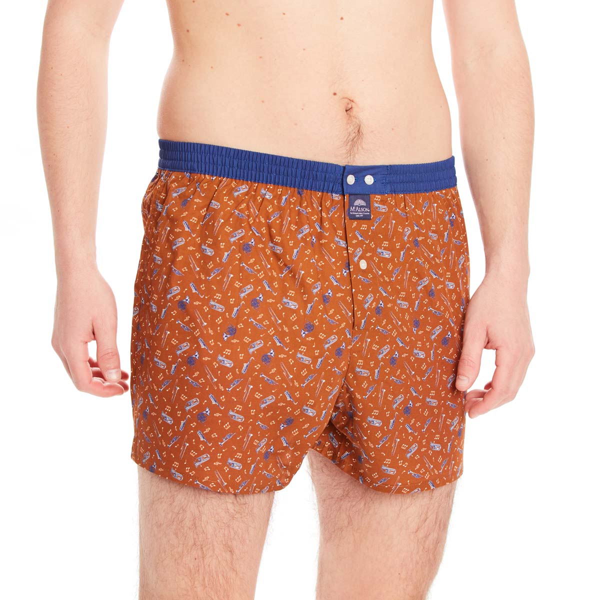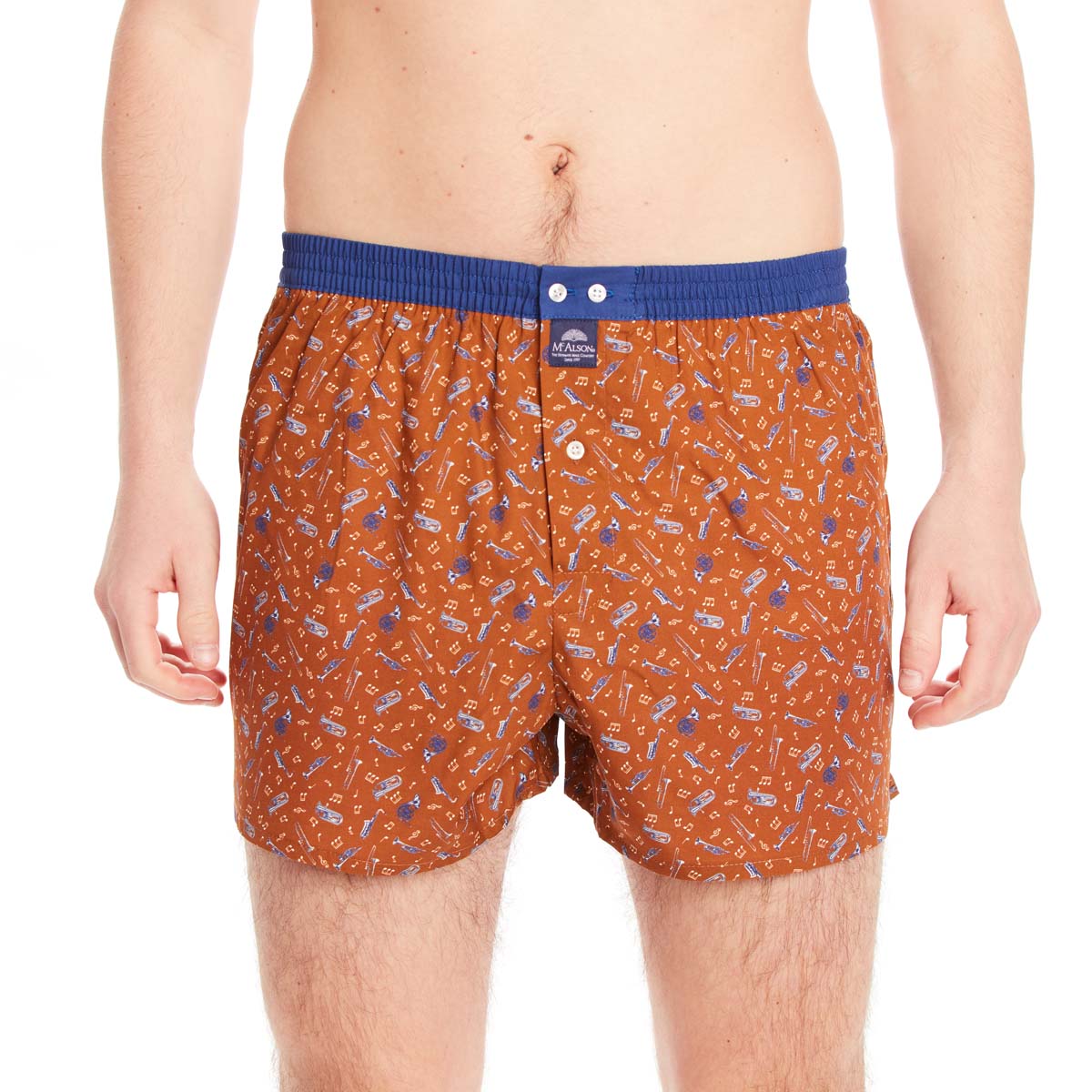 Caleçon Américain avec instruments bleu marine sur fond marron clair. La ceinture est bleu nuit.