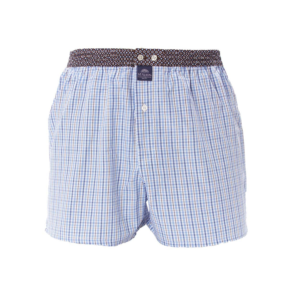 Caleçon Américain à petits carreaux bleu clair et marron foncé. La ceinture est un imprimé classique bleu marine sur fond marron foncé.
