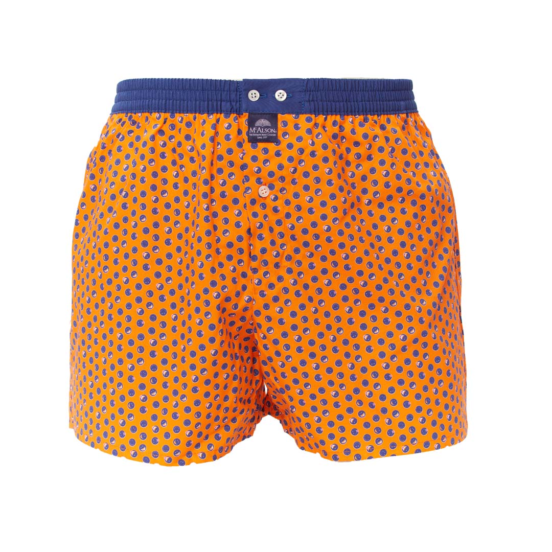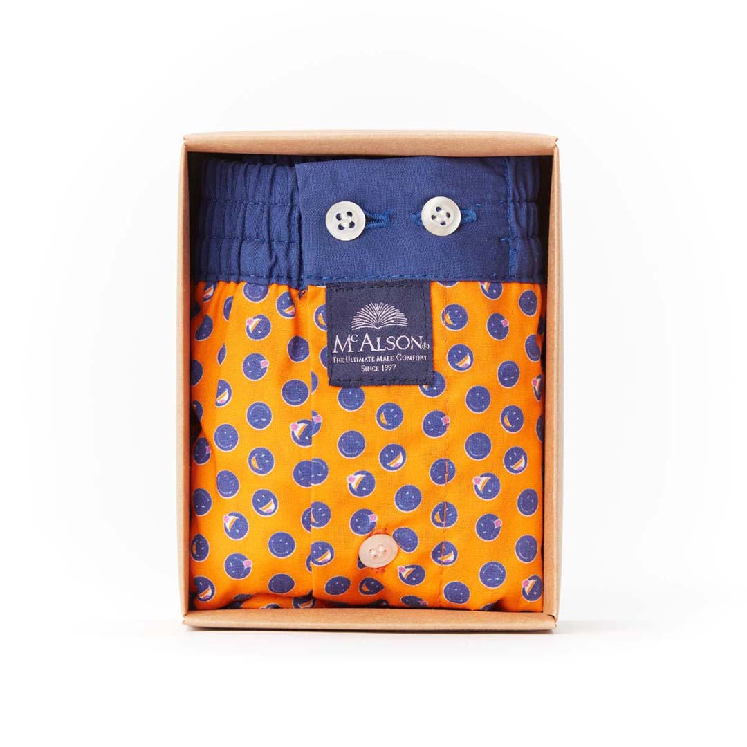 Caleçon Américain à smileys bleu marine sur fond orange. La ceinture est bleu marine.