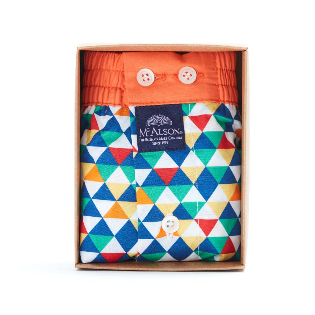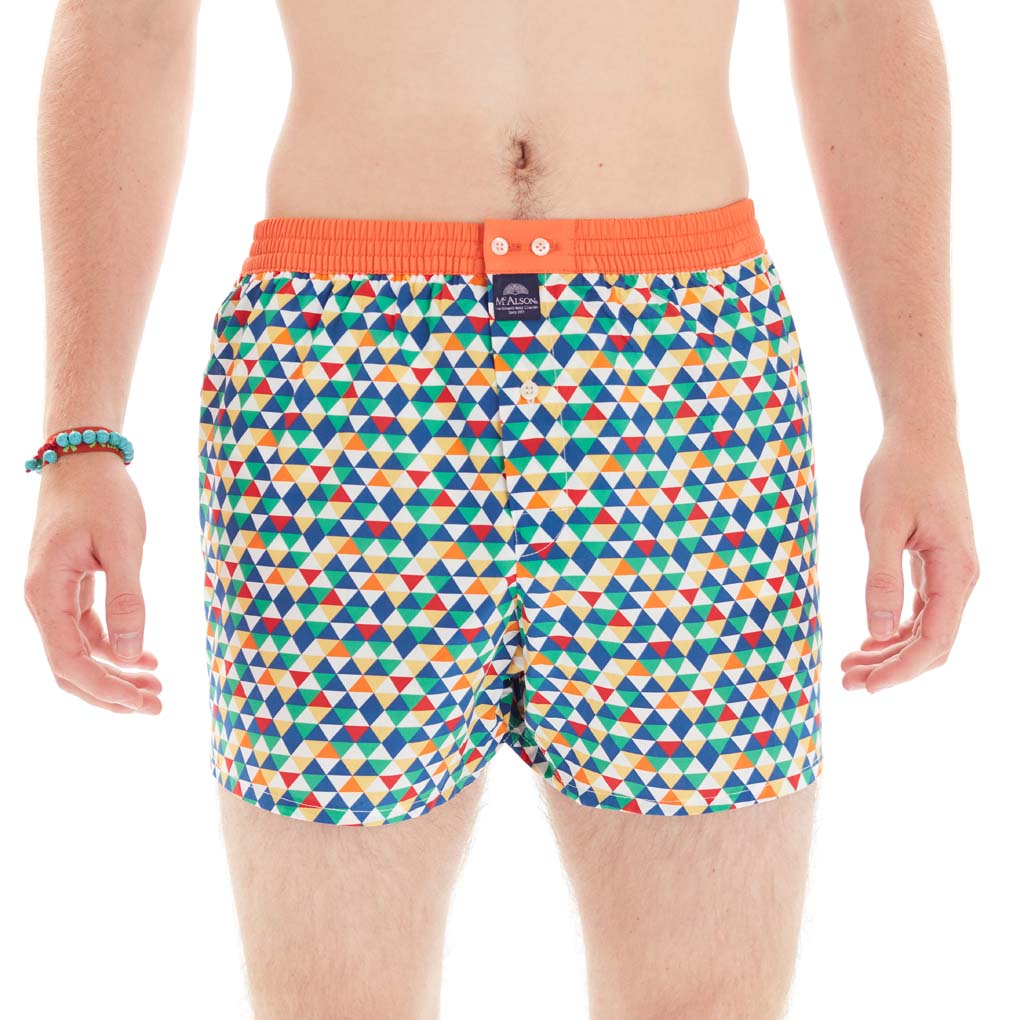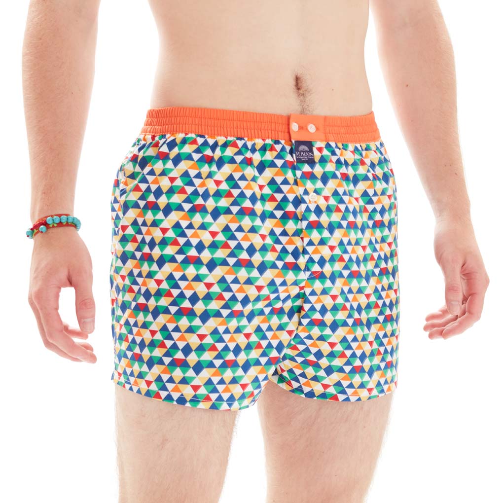 Caleçon Américain à triangle vert pomme, jaune, bleu moyen et orange. La ceinture est orange.