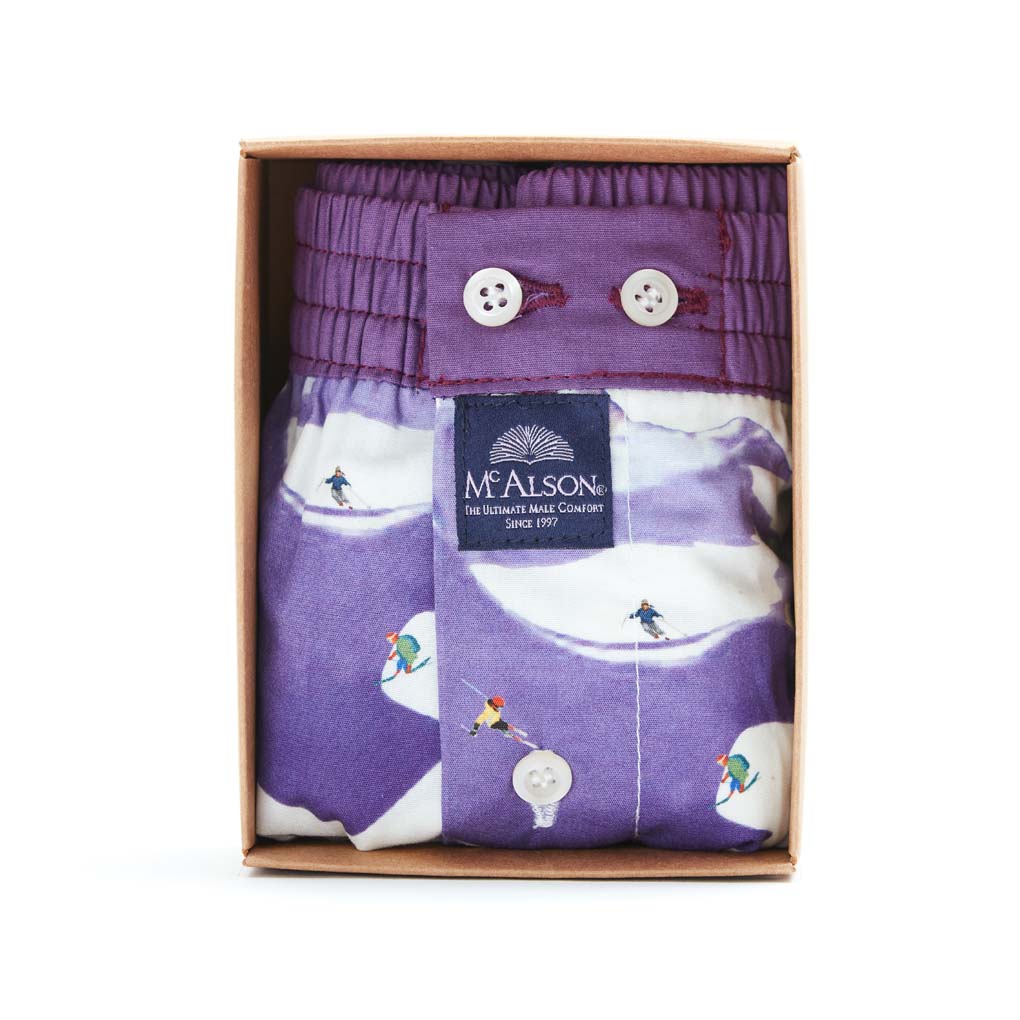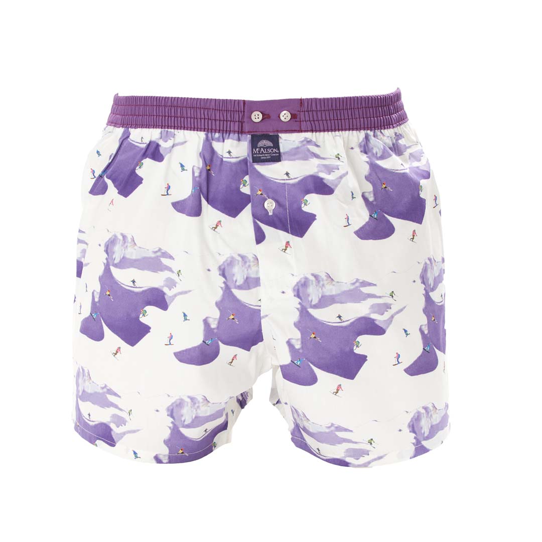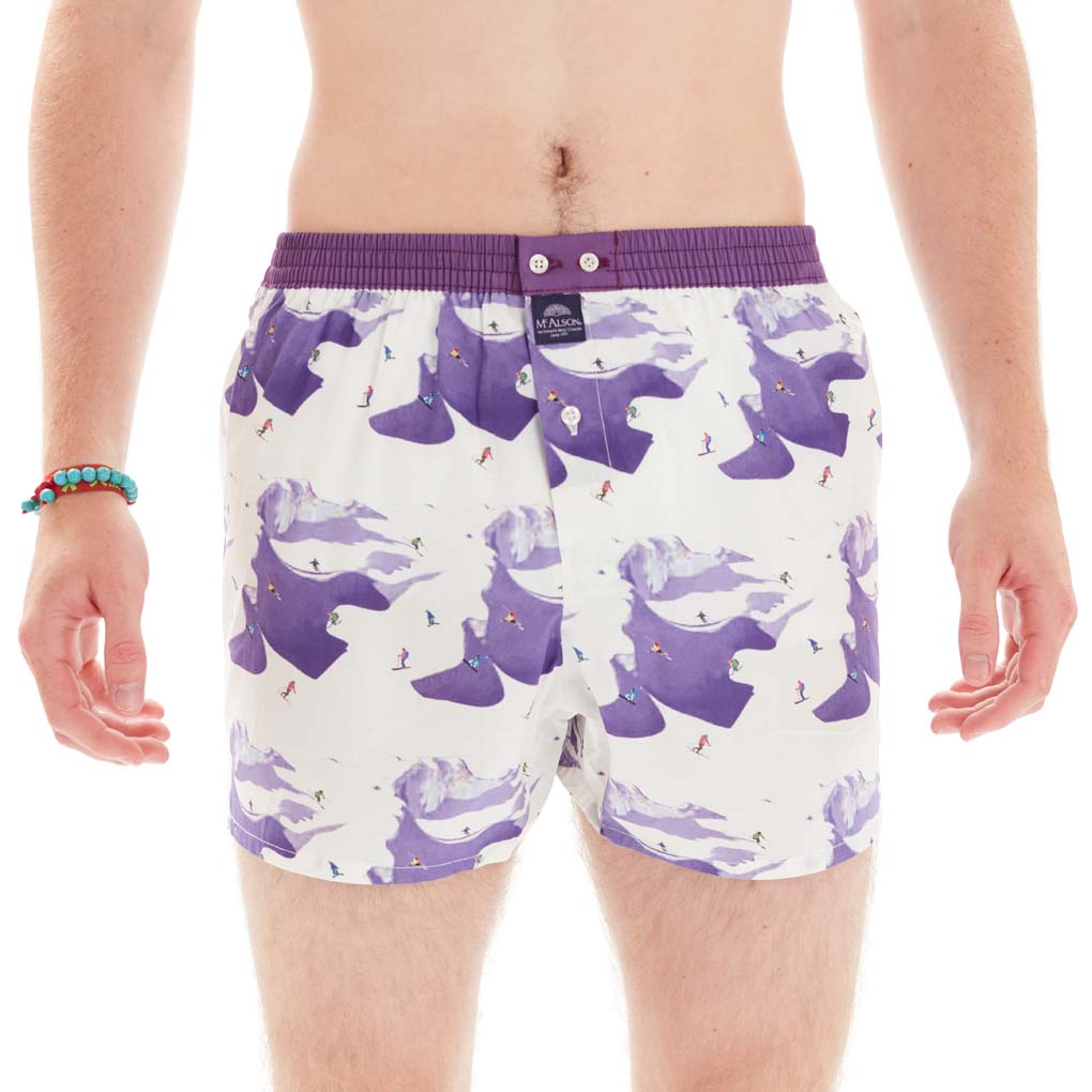 Caleçon Américain à skieurs descendant un imprimé montagne violet. La ceinture est violette.