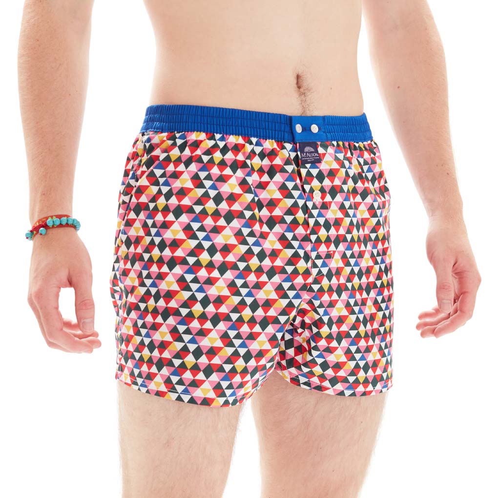 Pink, mid blue, red, dark green and yellow triangle print. The belt is mid blue.